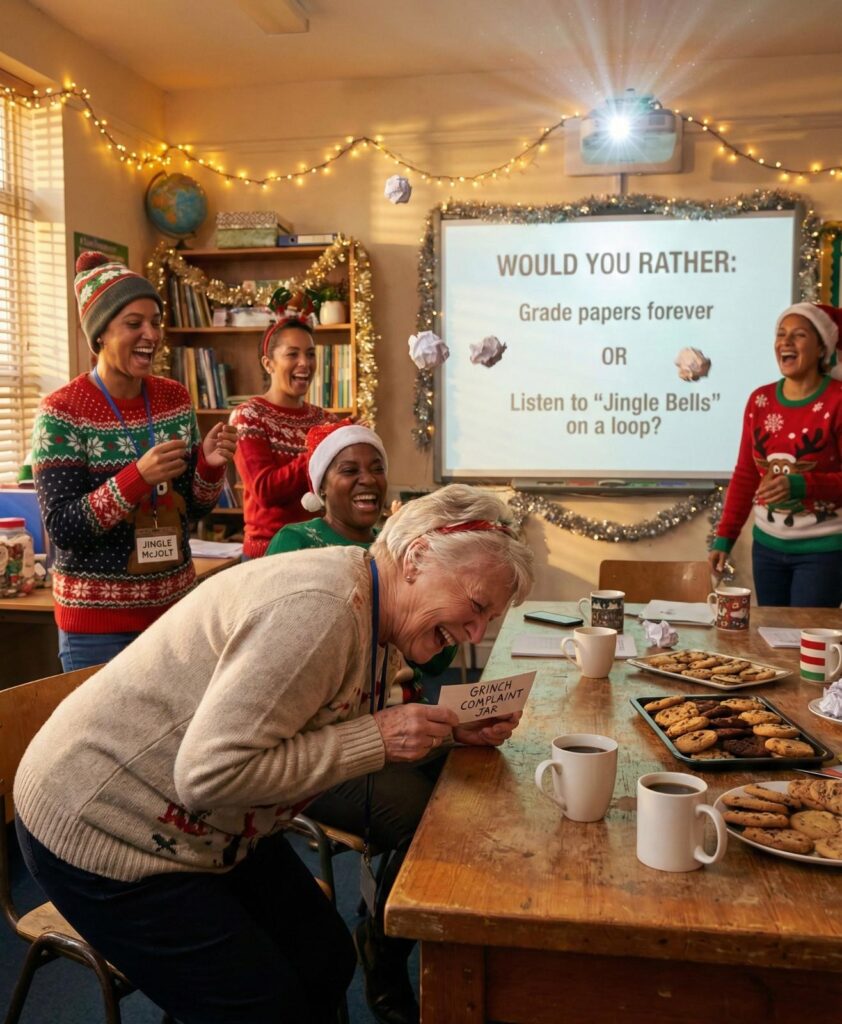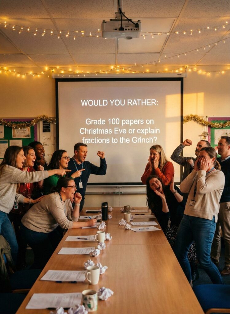 - AI Christmas Would You Rather – Prompt: “Generate 50 funny Christmas Would You Rather questions for a teacher holiday party. Include at least 10 about report cards and parent conferences.” Result: “Would you rather grade 100 papers on Christmas Eve or explain fractions to the Grinch?” Staff voted with feet – left for A, right for B. Chaos level: 8/10.
