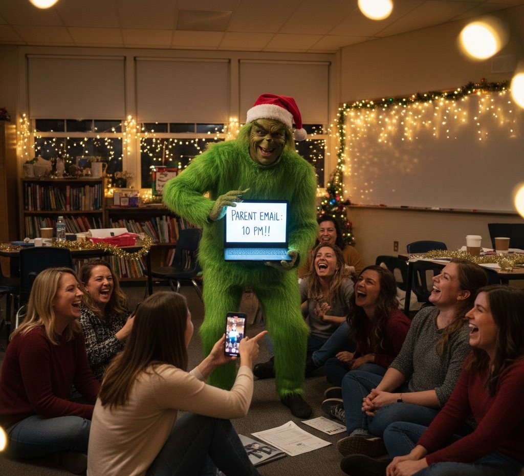 - Grinch Complaint Jar – Prompt: “Generate 30 teacher-specific complaints for a Grinch Jar game: funny but relatable, like ‘endless meetings about meetings.’” Result: Pull a slip → act it out like the Grinch. My “parent email at 10 p.m.” impression won the night.