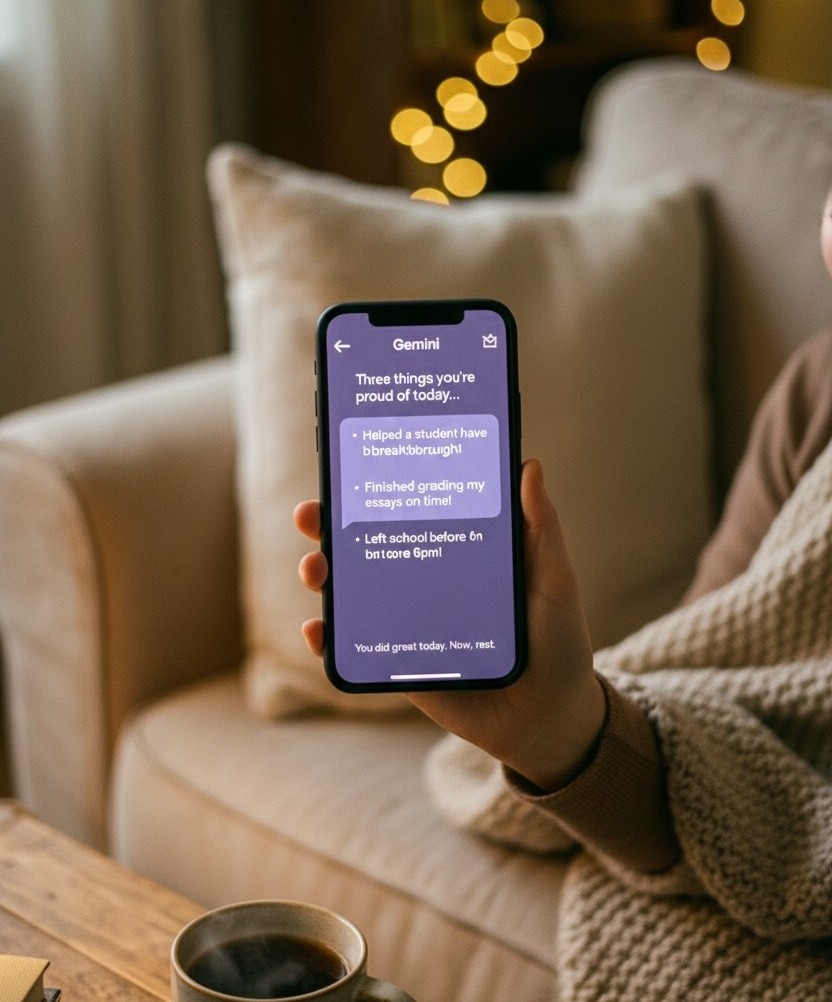“Write me three things I’m proud of from today and one gentle plan for tomorrow that protects my energy.”