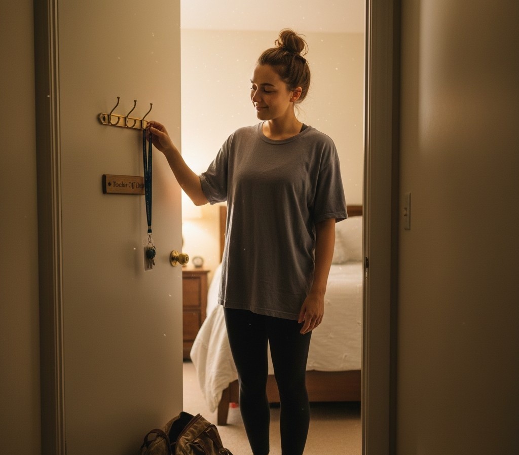 - Lanyard off → hung on the “Teacher Off Duty” hook (a $3 Command hook labeled with Gemini)