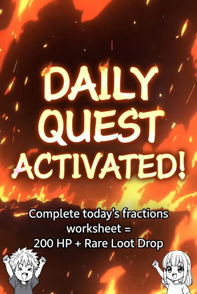 “Daily Quest: Complete today’s fractions mission = 150 HP plus chance for Rare Loot Drop.”