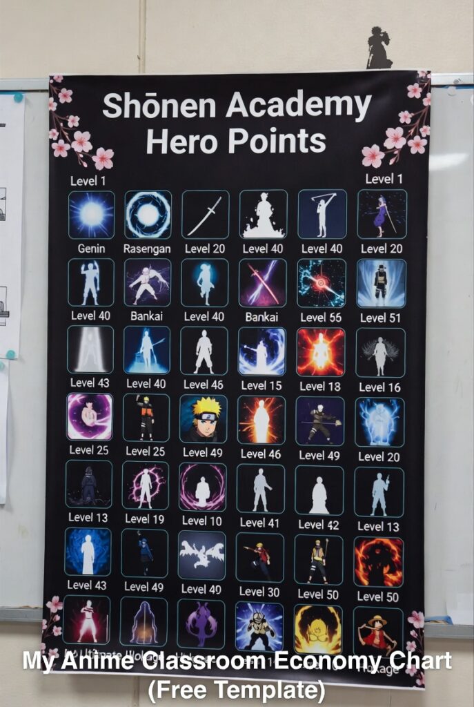 “Create a 50 level anime style classroom economy progression table. Each level has a Japanese inspired title (Genin to Hokage style), a new privilege, and an exact Hero Point requirement. Include 10 secret Ultimate Jutsu rewards at milestones.”